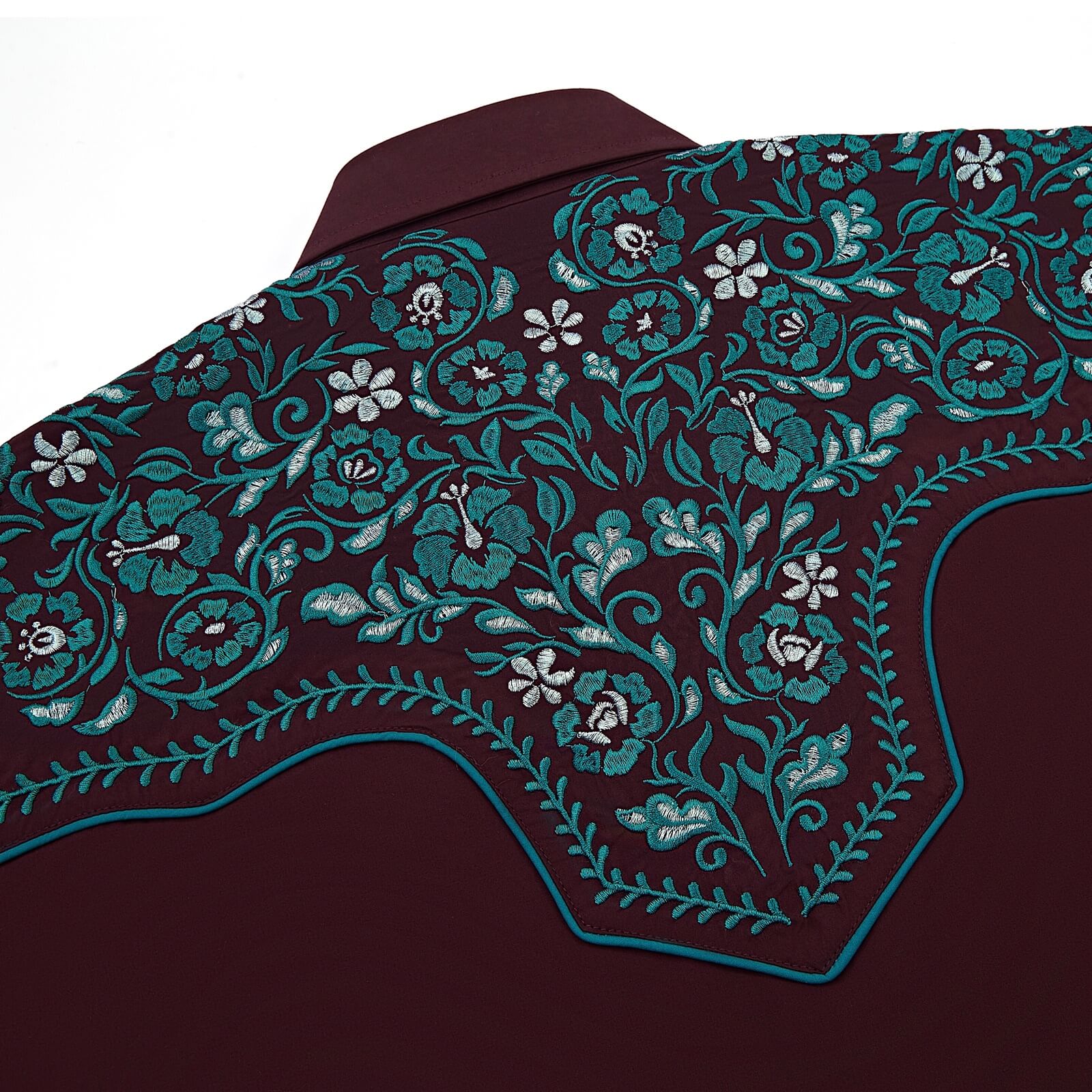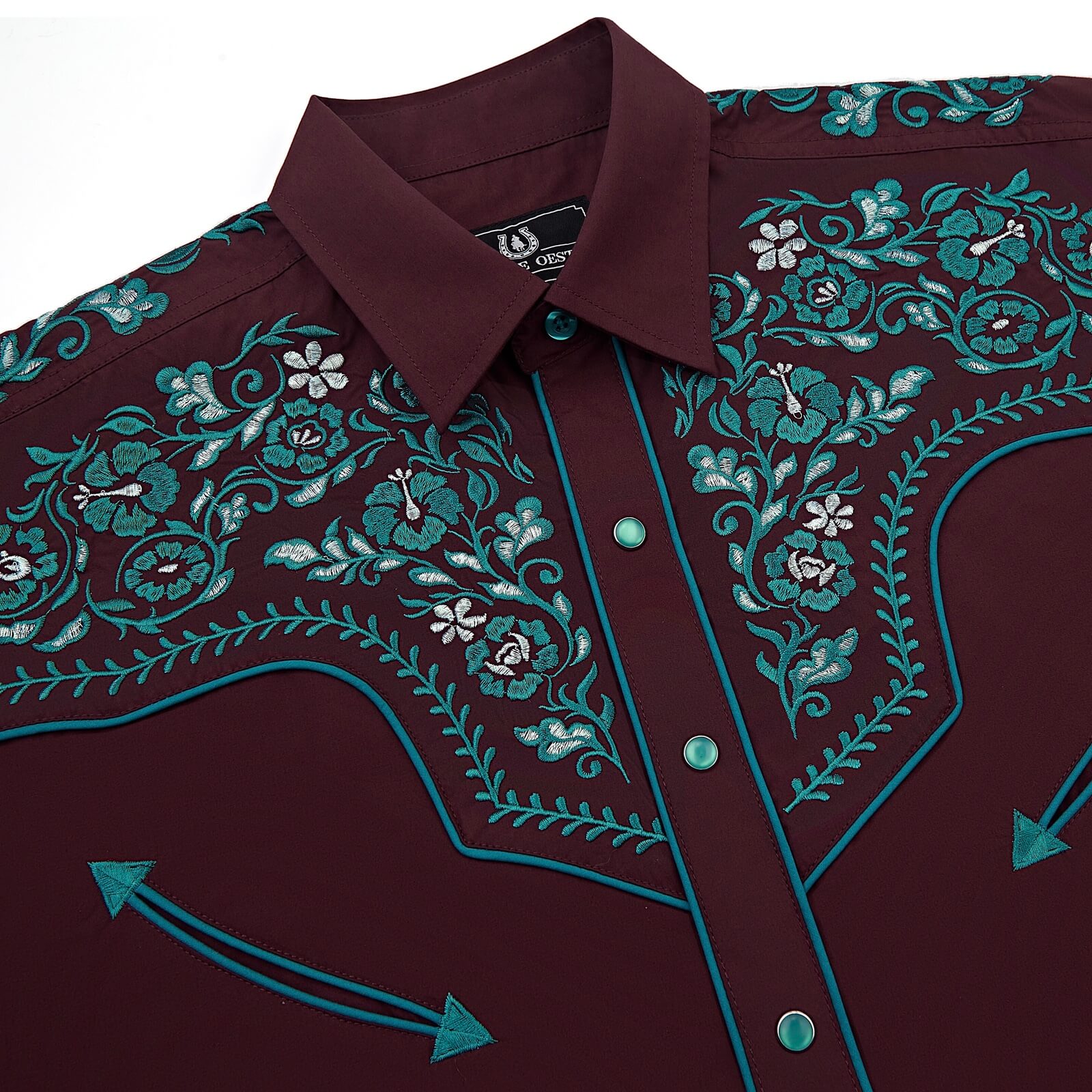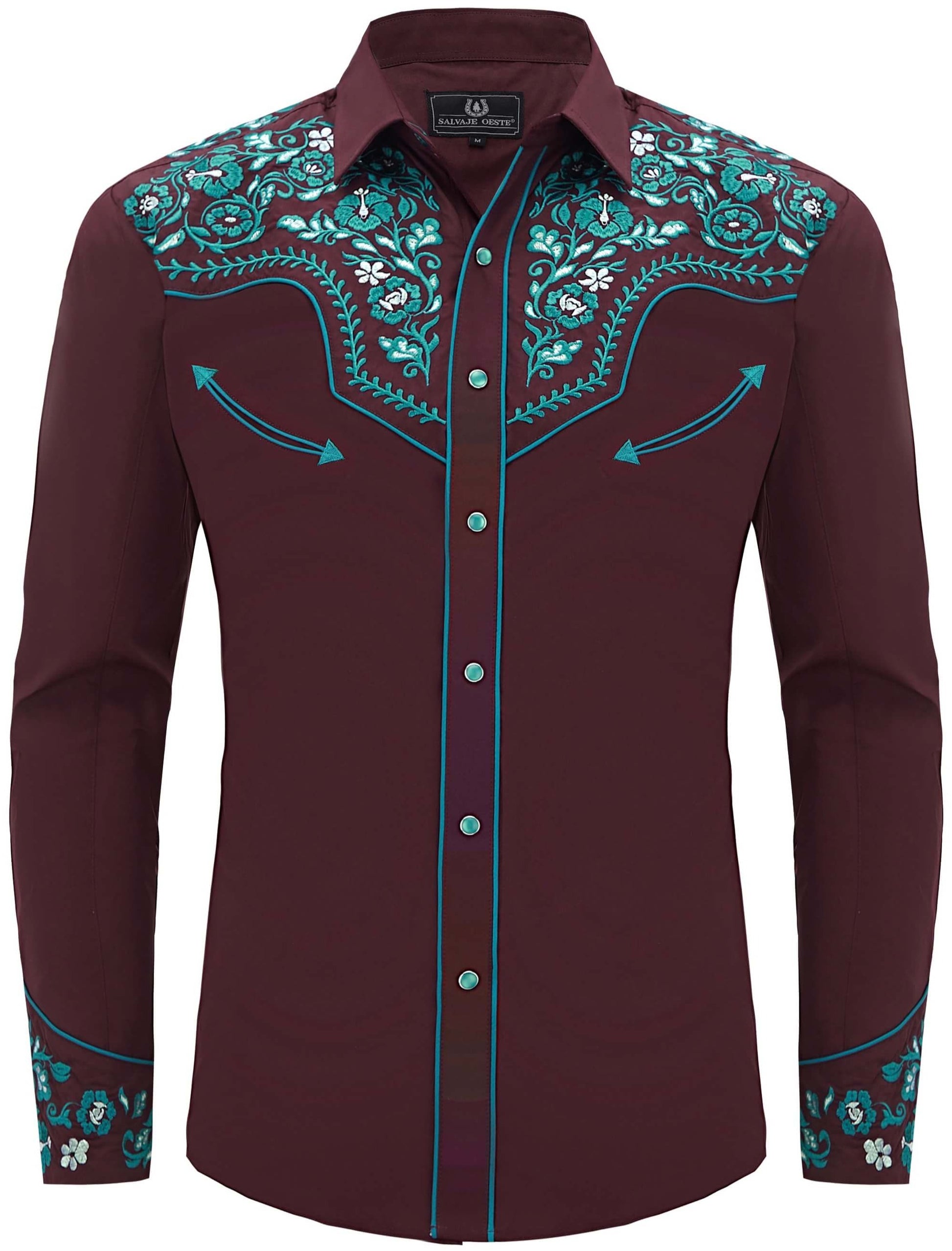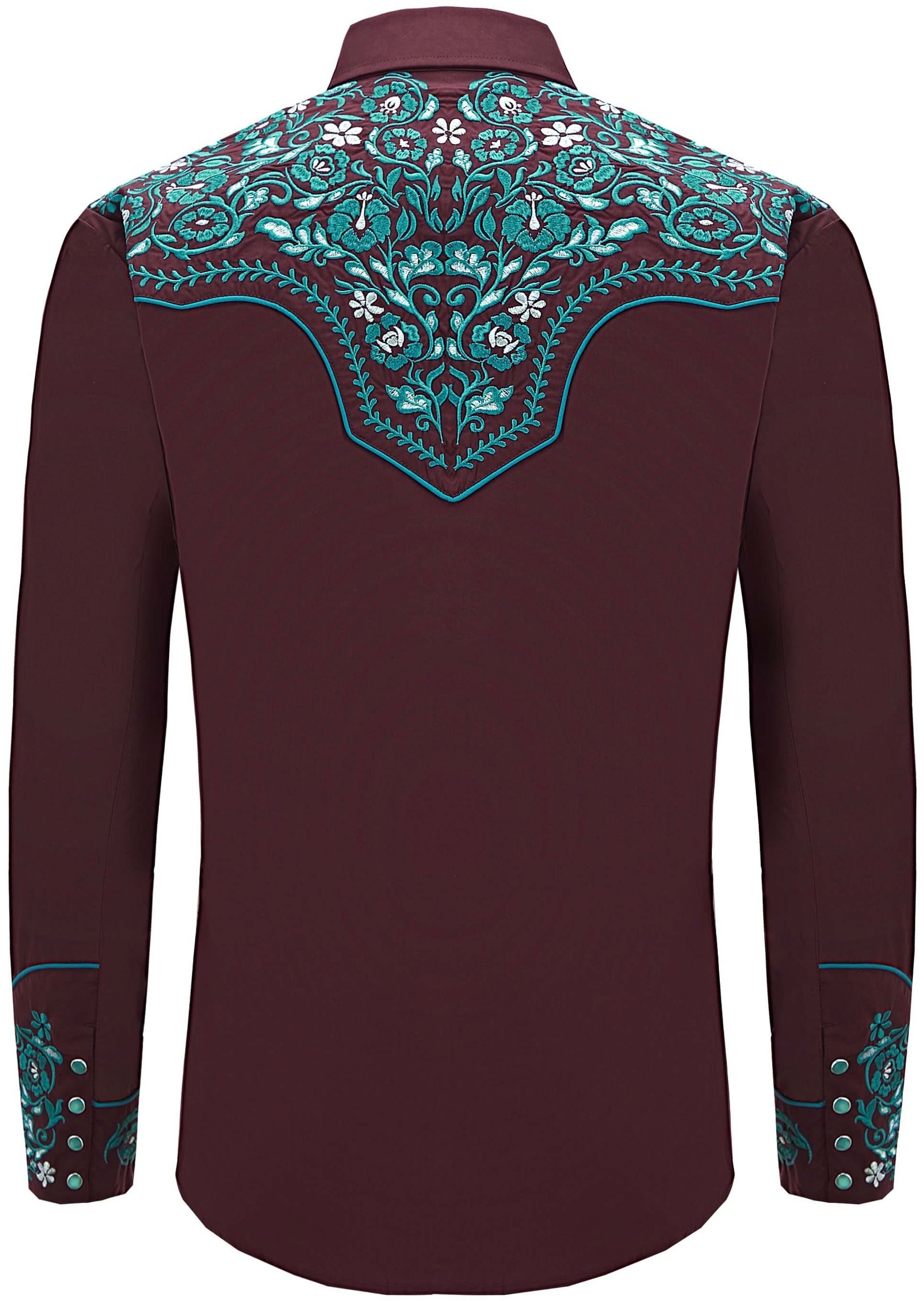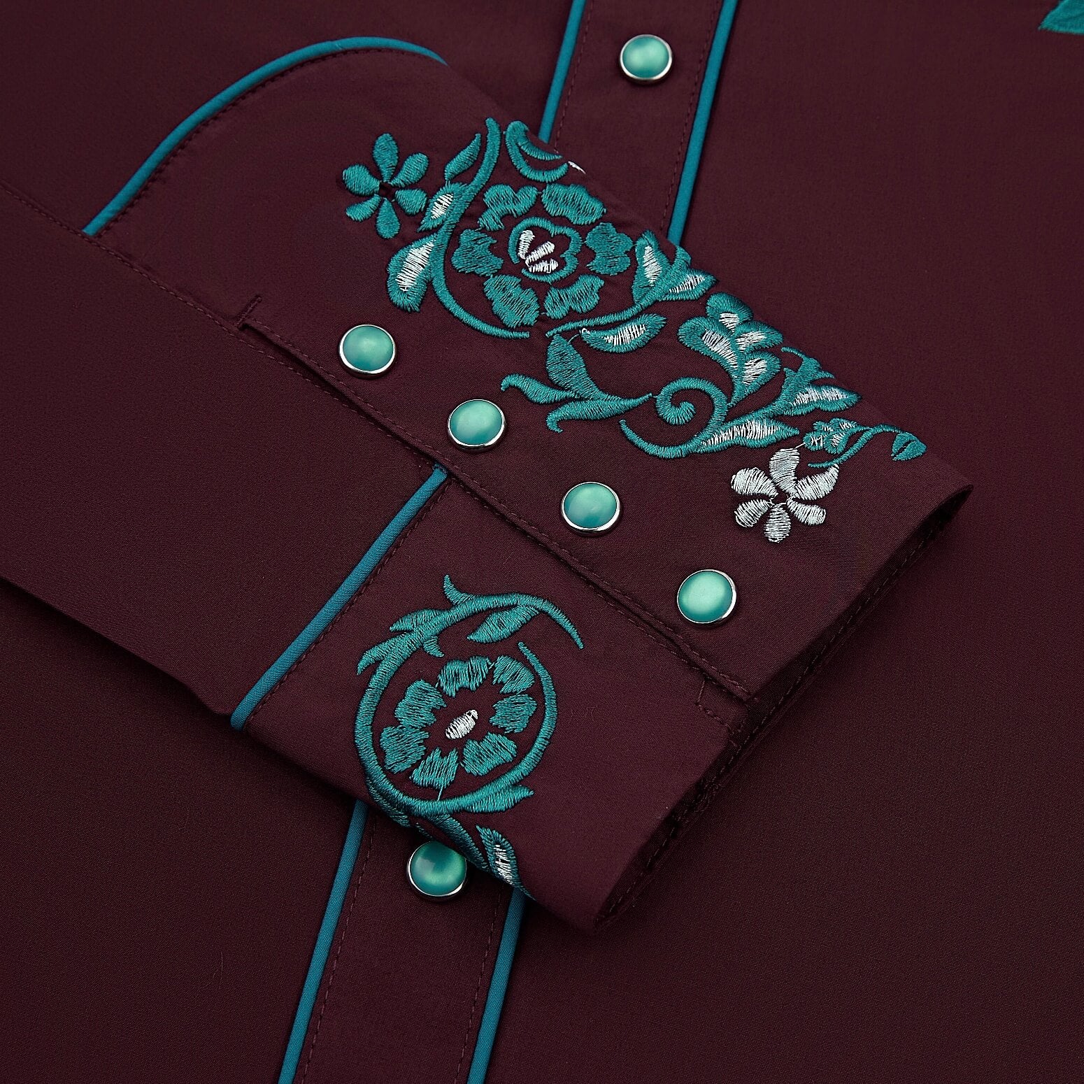 Introducing Rolling Dusk Men’s Embroidered Western Pearl Snap Shirt, a striking dark purple long-sleeve western dress shirt with real smiley pockets, genuine floral embroidery, and authentic pearl snaps. Designed with bold daring western style that commands any room, this shirt is made for the confident and sophisticated man. If you have a flair for the audacious, and an appreciation of that which is unique, this fearless and authentic western piece is the perfect new addition to your wardrobe.