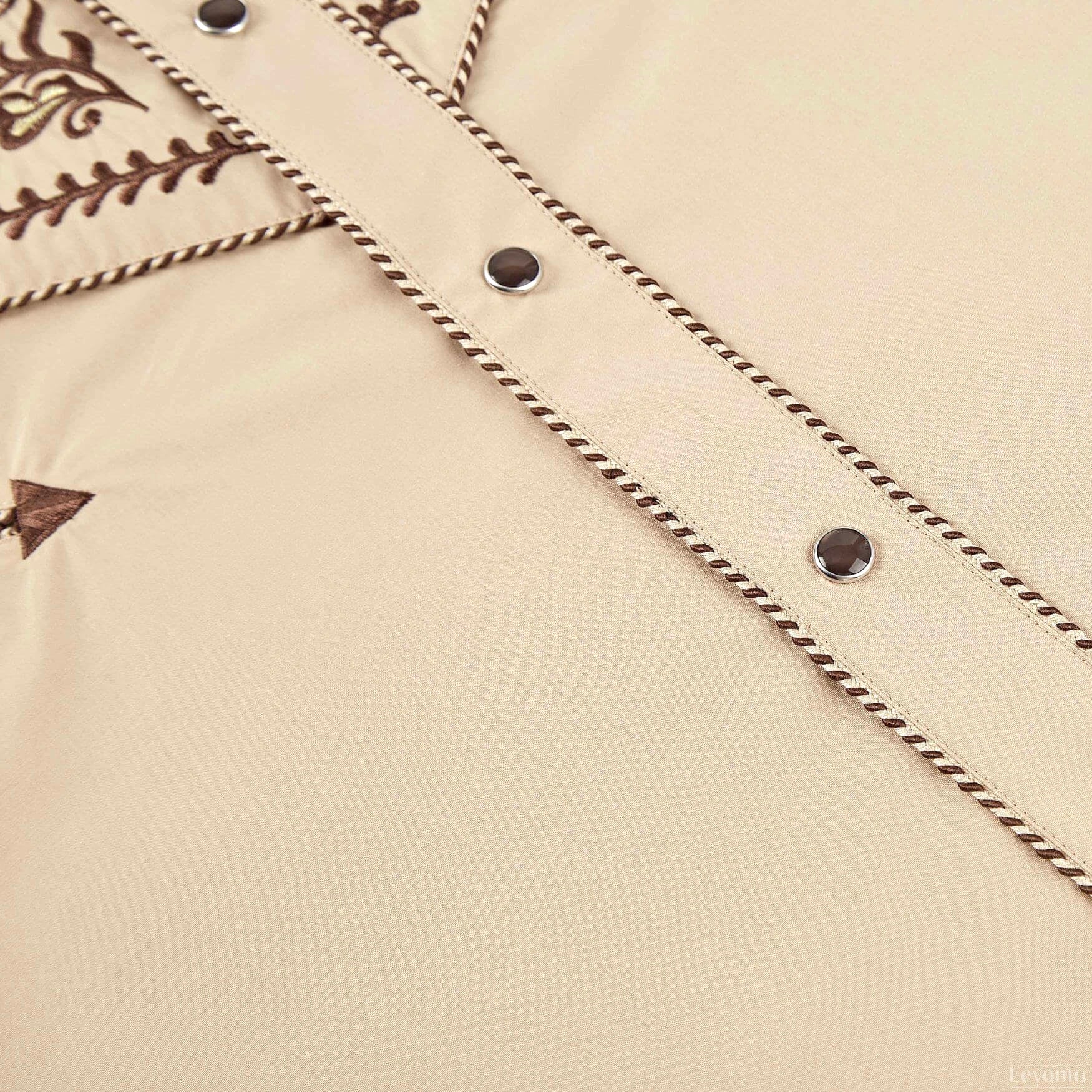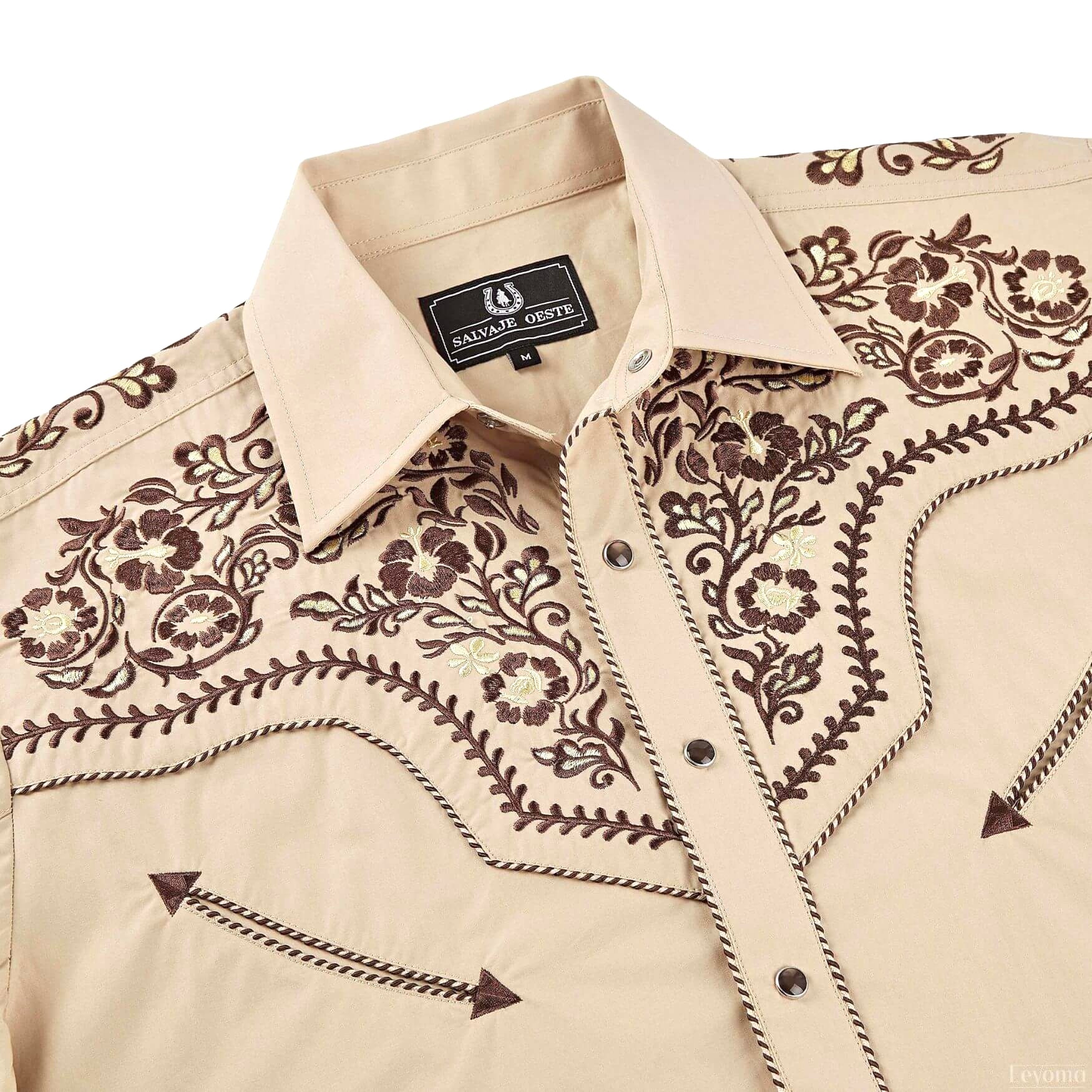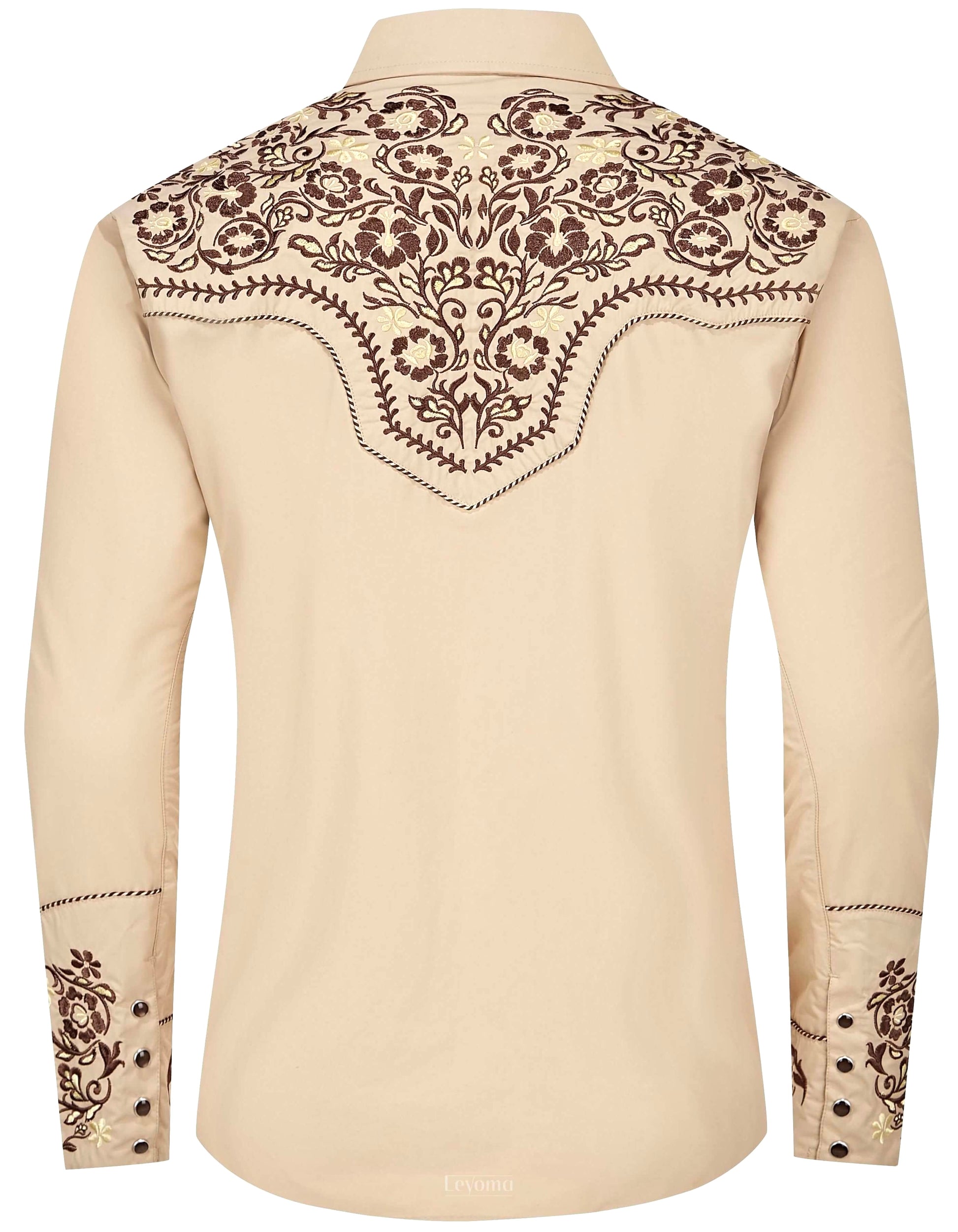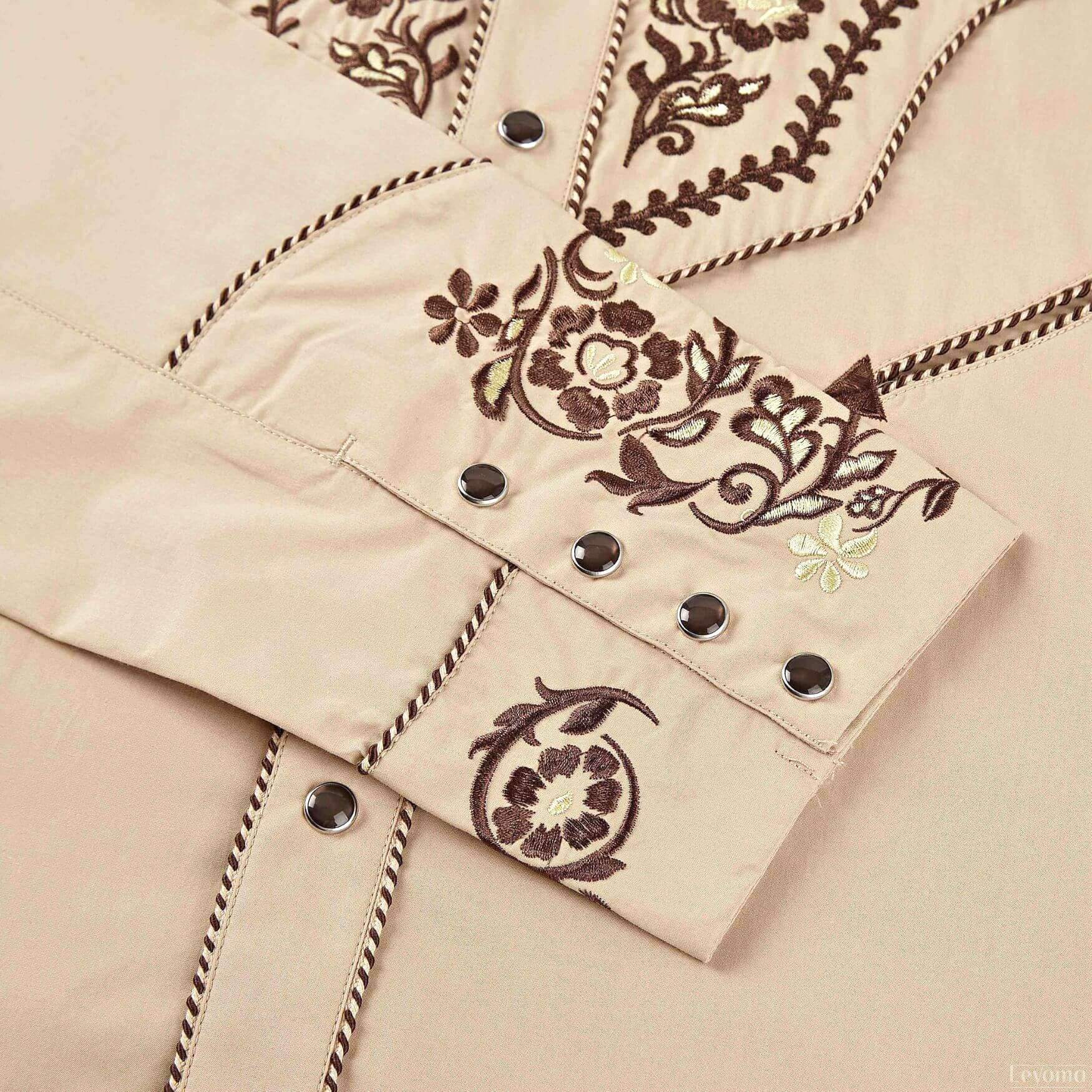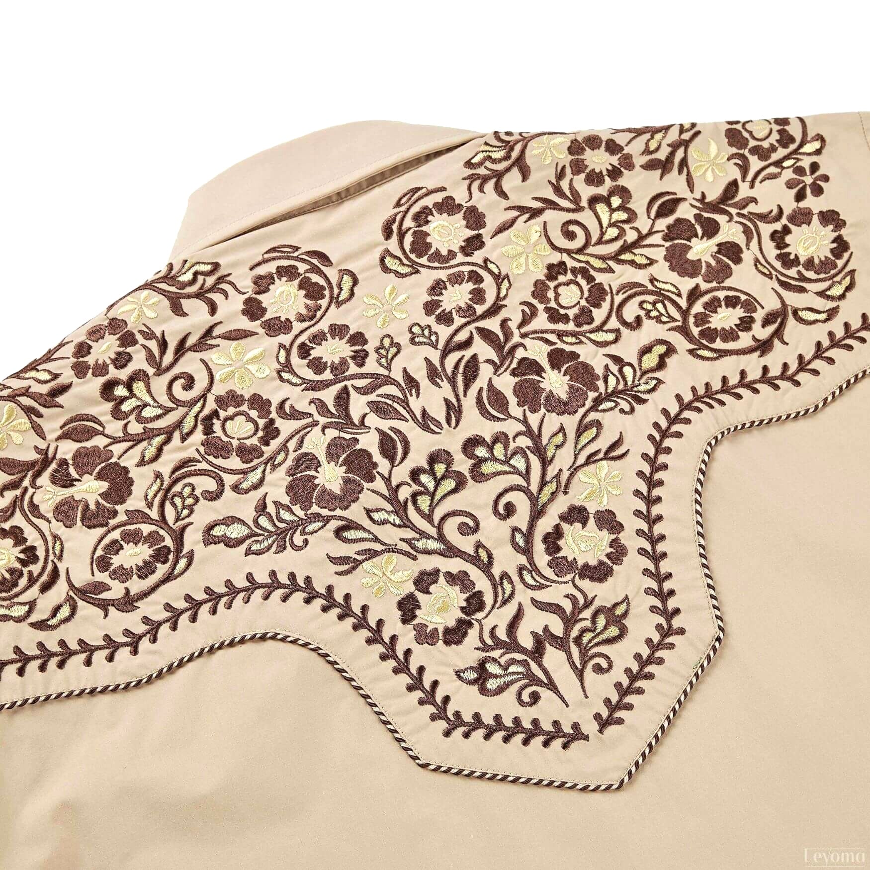 Introducing El Jefe Men’s Embroidered Western Pearl Snap Shirt, a striking beige/tan long-sleeve western dress shirt with real smiley pockets, genuine floral embroidery, and authentic pearl snaps. Designed with bold daring western style that commands any room, this shirt is made for the confident and sophisticated man. If you have a flair for the audacious, and an appreciation of that which is unique, this fearless and authentic western piece is the perfect new addition to your wardrobe.