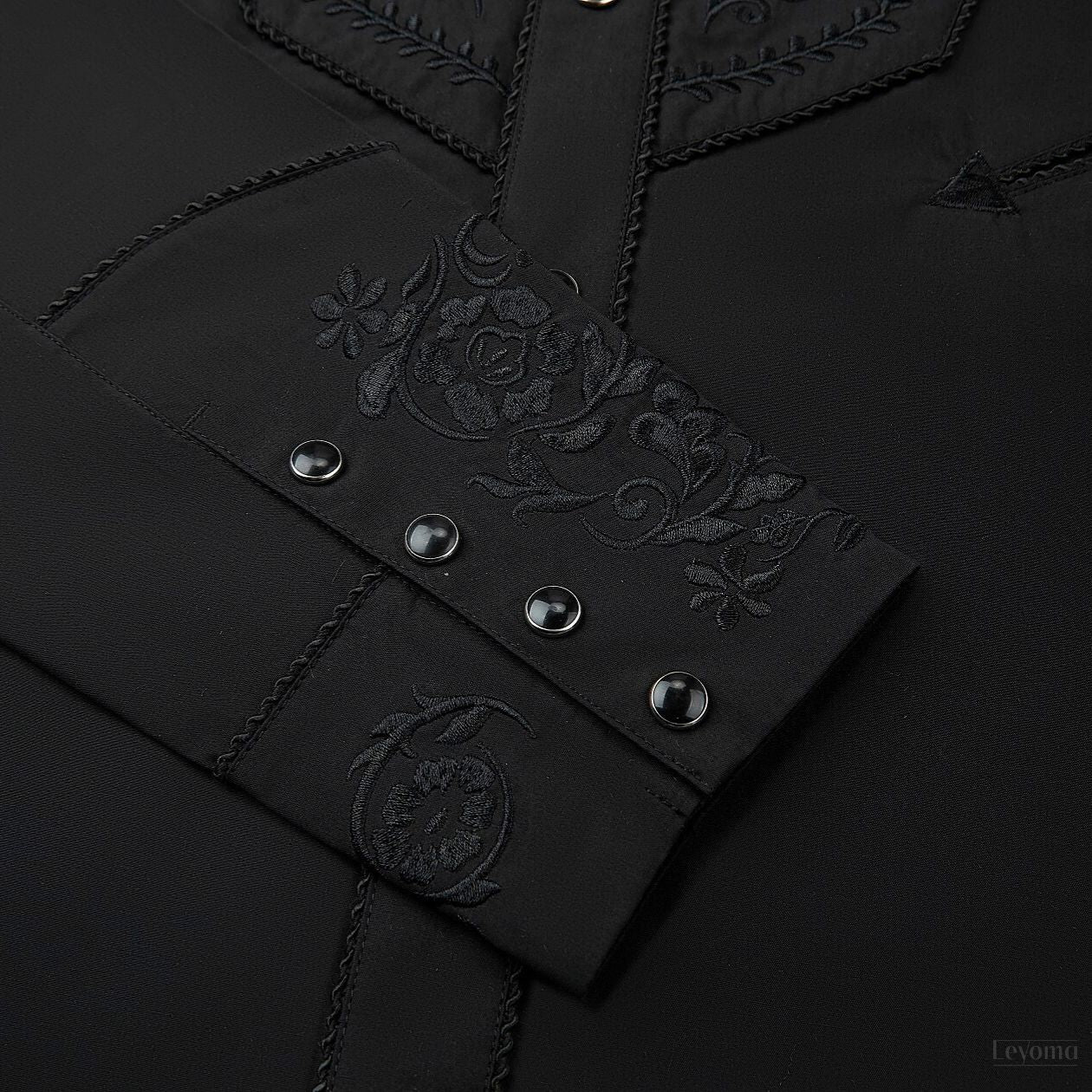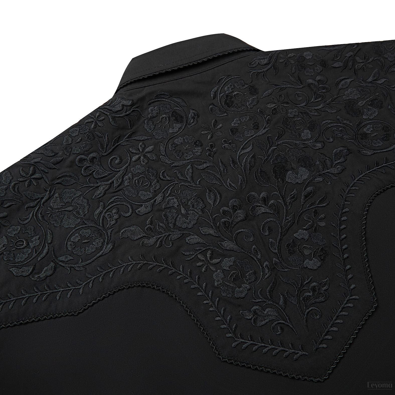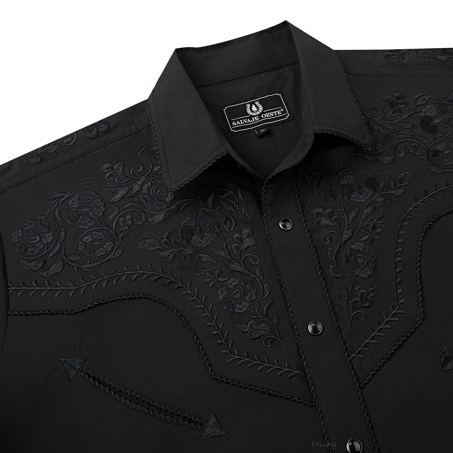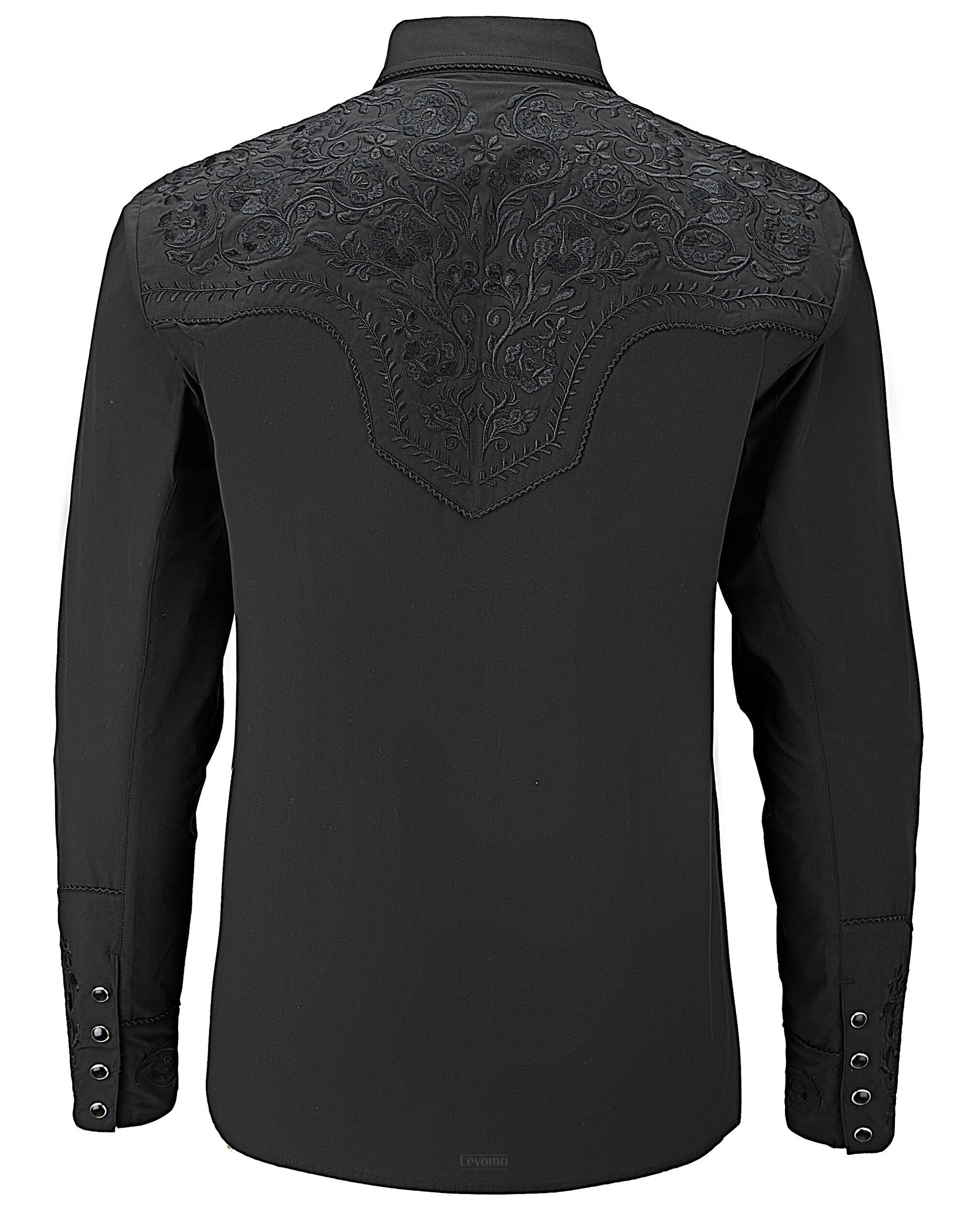 Introducing The Noble Friesian Men’s Embroidered Western Pearl Snap Shirt, a striking black long-sleeve western shirt with black yokes, real smiley pockets, genuine black floral embroidery, and authentic pearl snaps. Designed with bold daring western style that commands any room, this shirt is made for the confident and sophisticated man. If you have a flair for the audacious, and an appreciation of that which is unique, this fearless and authentic western piece is the perfect new addition to your wardrobe.