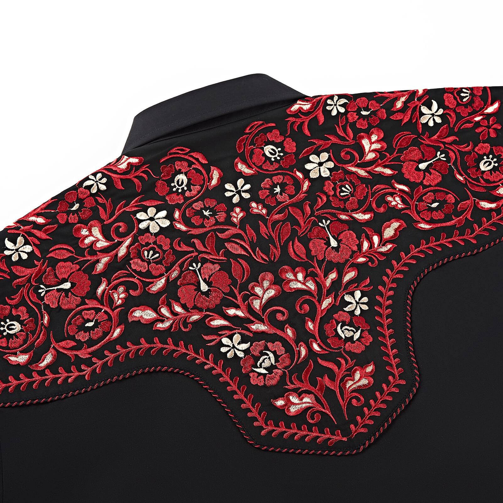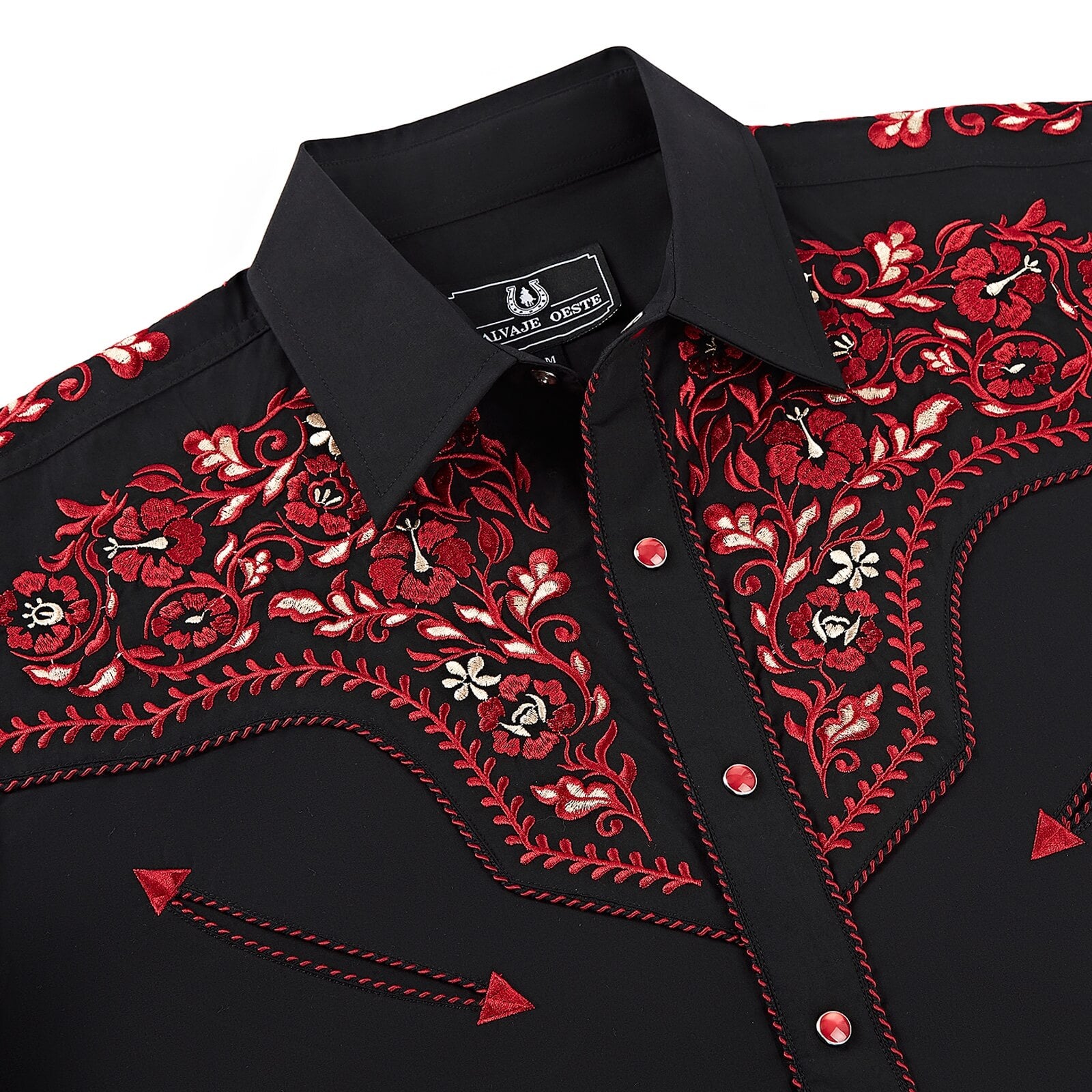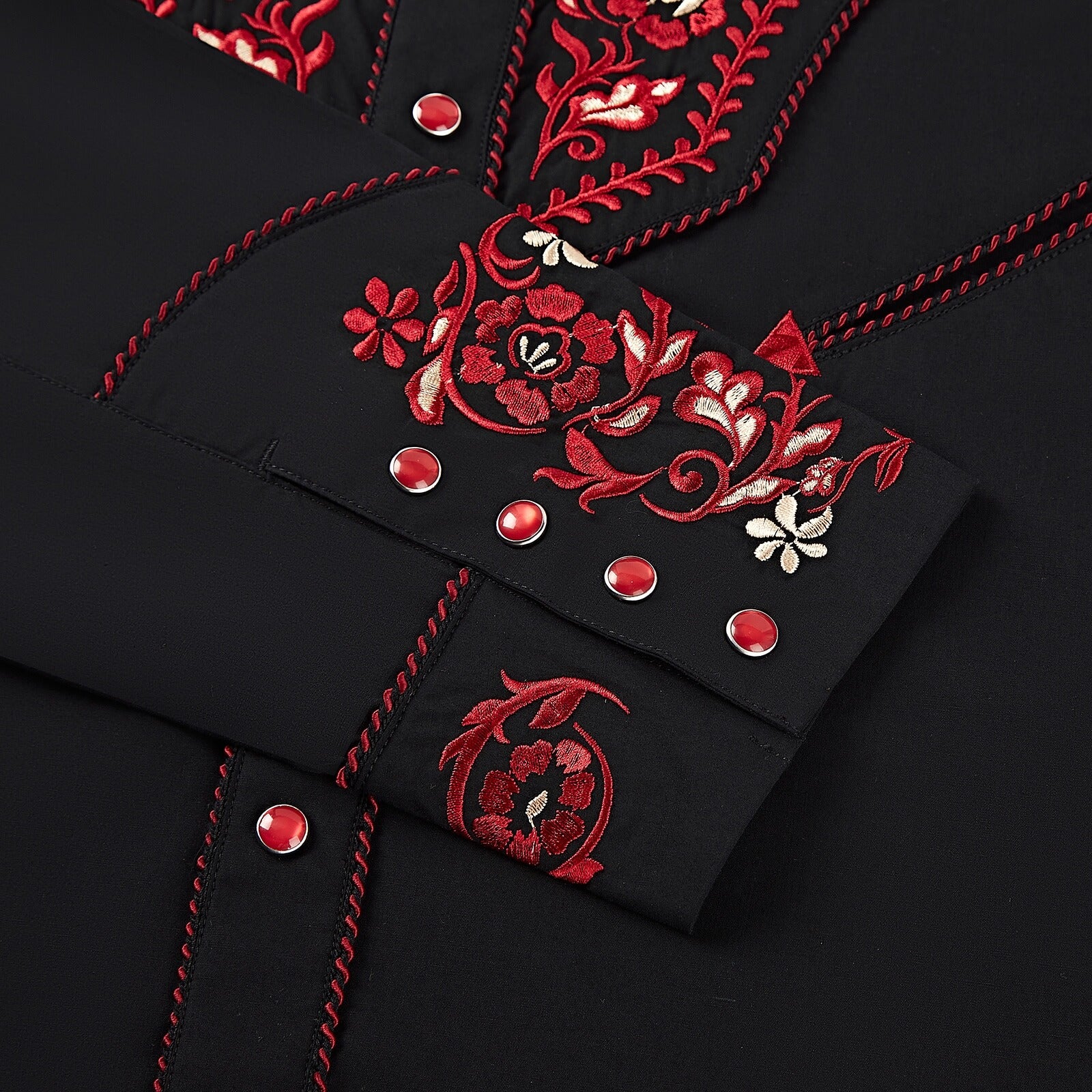• Intricate red and white embroidery on western yokes and cuffs