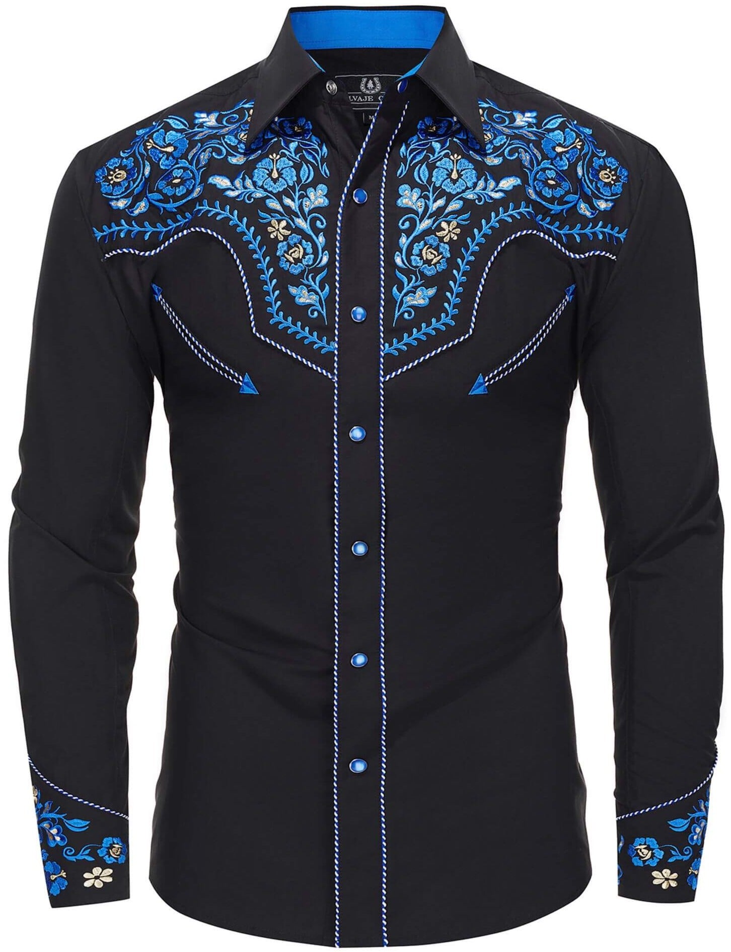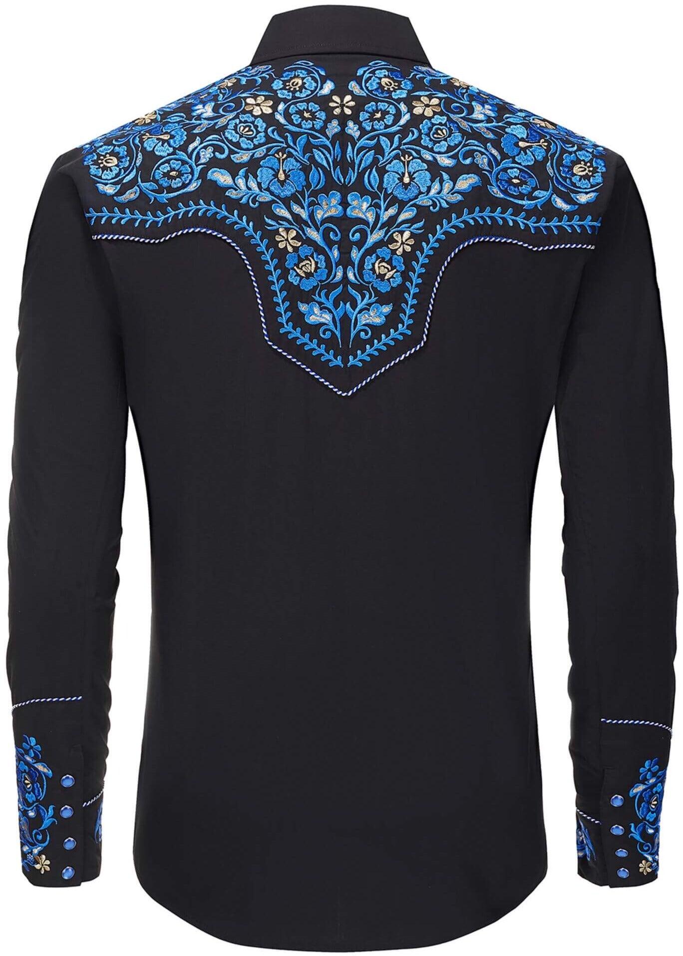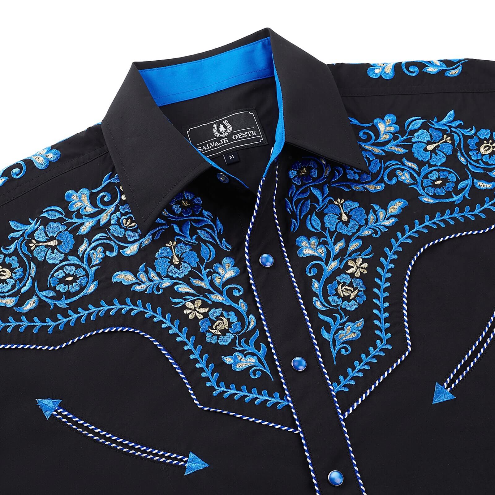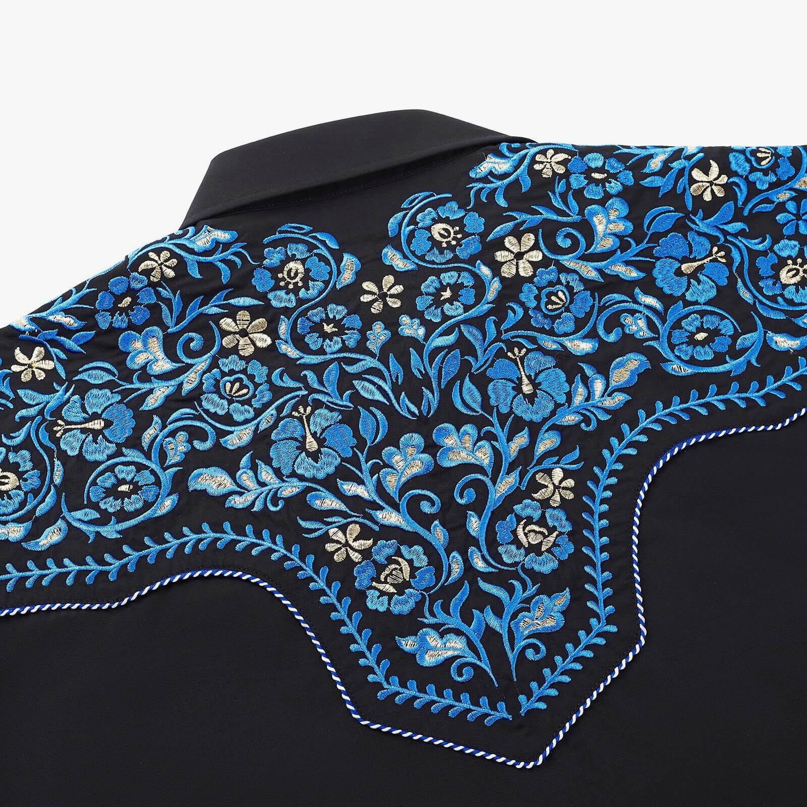 • Intricate blue embroidery on western yokes and cuffs