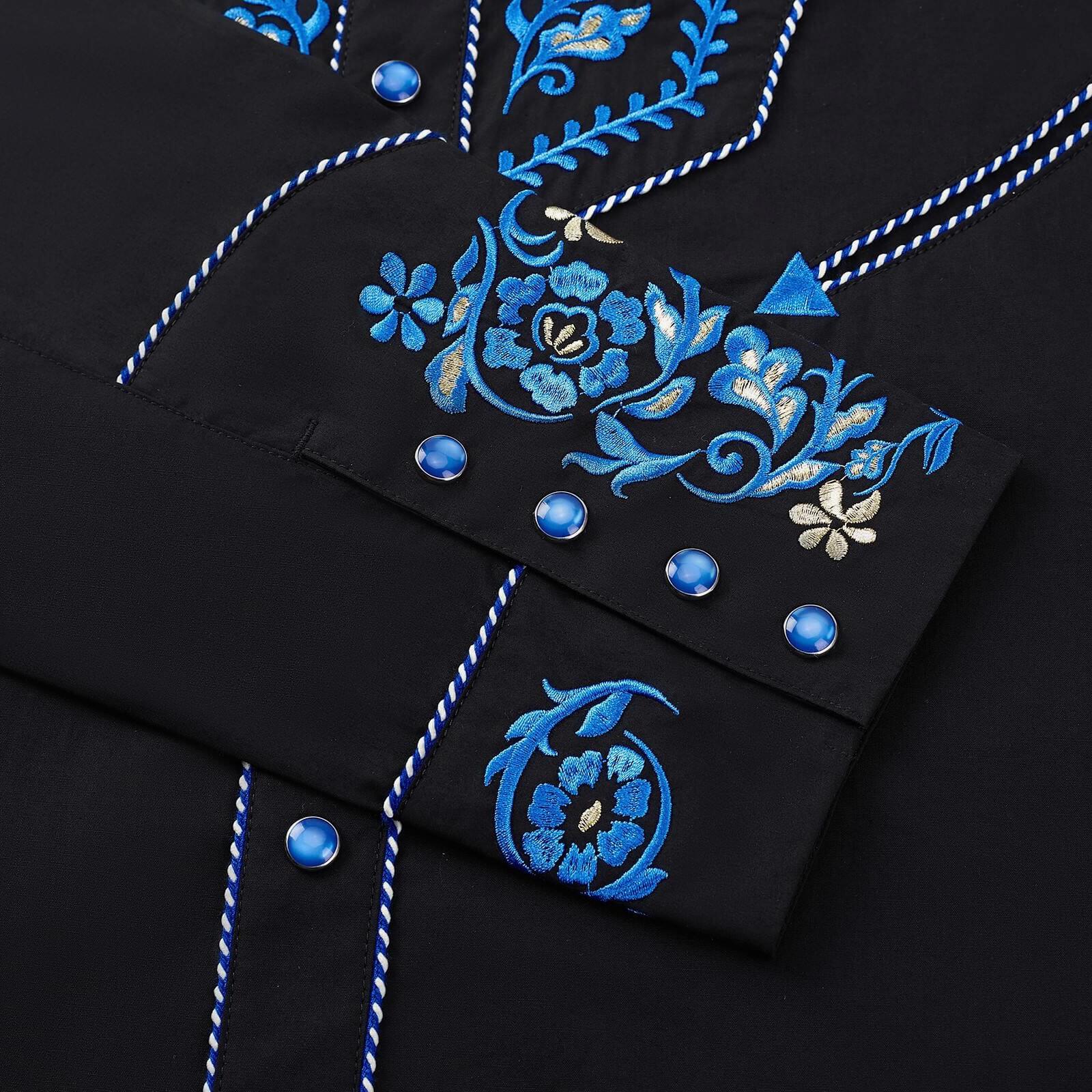 Introducing River Orchid Men’s Embroidered Western Pearl Snap Shirt, a striking black long-sleeve western dress shirt with real smiley pockets, genuine floral embroidery, and authentic pearl snaps. Designed with bold daring western style that commands any room, this shirt is made for the confident and sophisticated man. If you have a flair for the audacious, and an appreciation of that which is unique, this fearless and authentic western piece is the perfect new addition to your wardrobe.