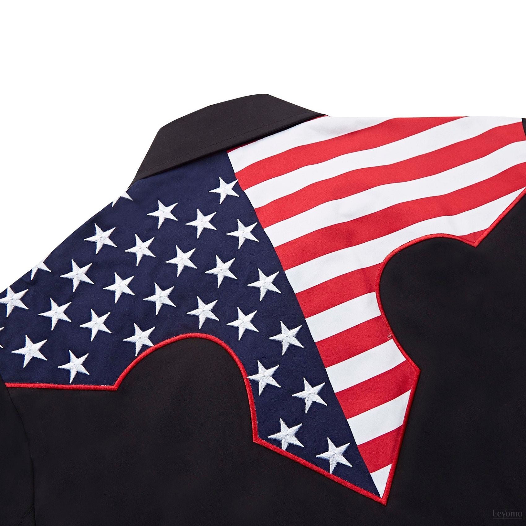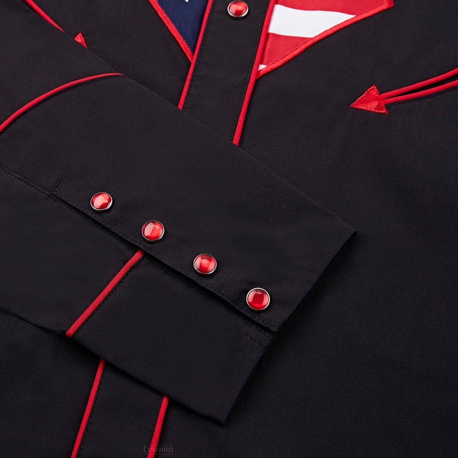 Introducing the Stars & Stripes Men’s Embroidered Western Pearl Snap Shirt, a patriotic black long-sleeve western dress shirt with western American flag yokes, duel front pockets, genuine embroidery, and authentic pearl snap down front closure. Designed with bold daring western style that commands any room, this shirt is made for the patriotic American man. If you have a flair for the audacious, and an appreciation of that which is unique, this fearless and authentic western piece is the perfect new addition to your wardrobe.