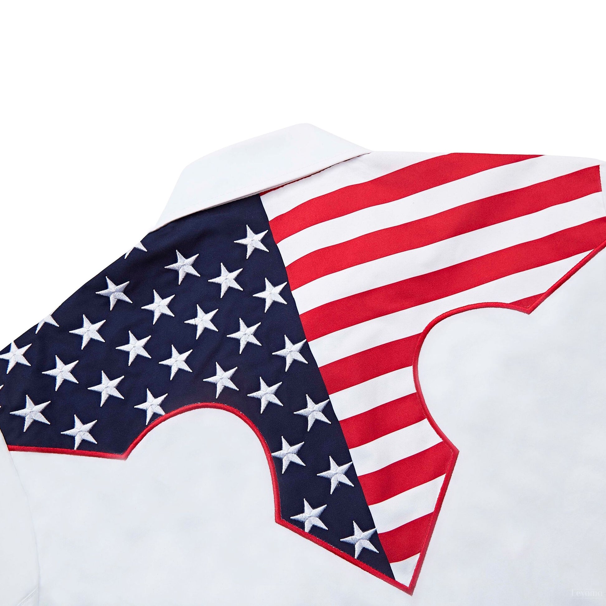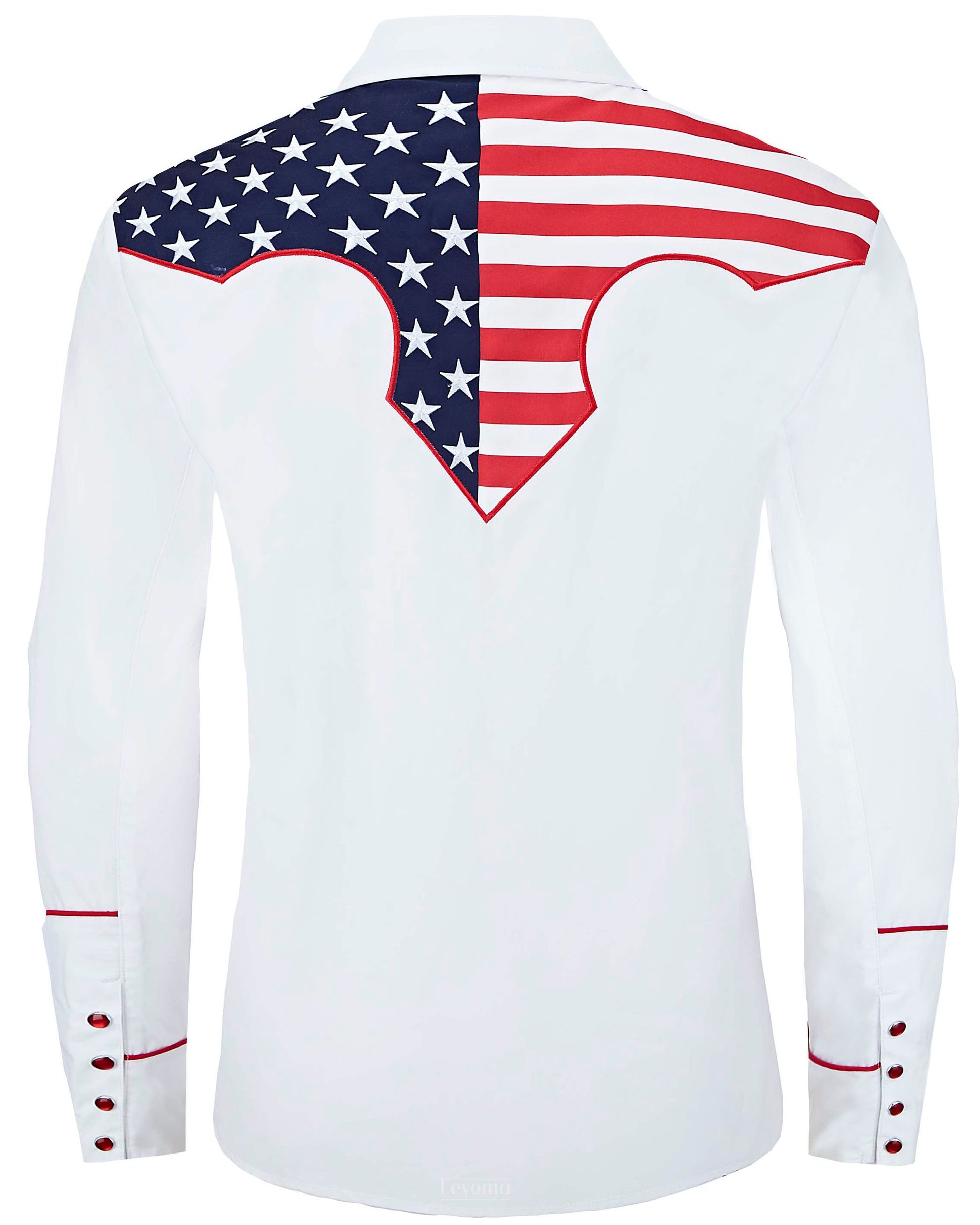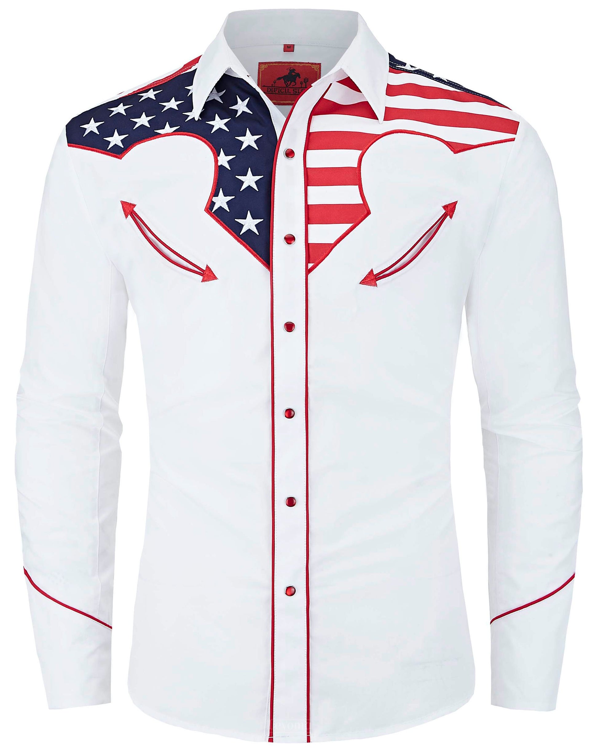 Introducing the Stars & Stripes Men’s Embroidered Western Pearl Snap Shirt, a patriotic white long-sleeve western dress shirt with western American flag yokes, duel front pockets, genuine embroidery, and authentic pearl snap down front closure. Designed with bold daring western style that commands any room, this shirt is made for the patriotic American man. If you have a flair for the audacious, and an appreciation of that which is unique, this fearless and authentic western piece is the perfect new addition to your wardrobe.