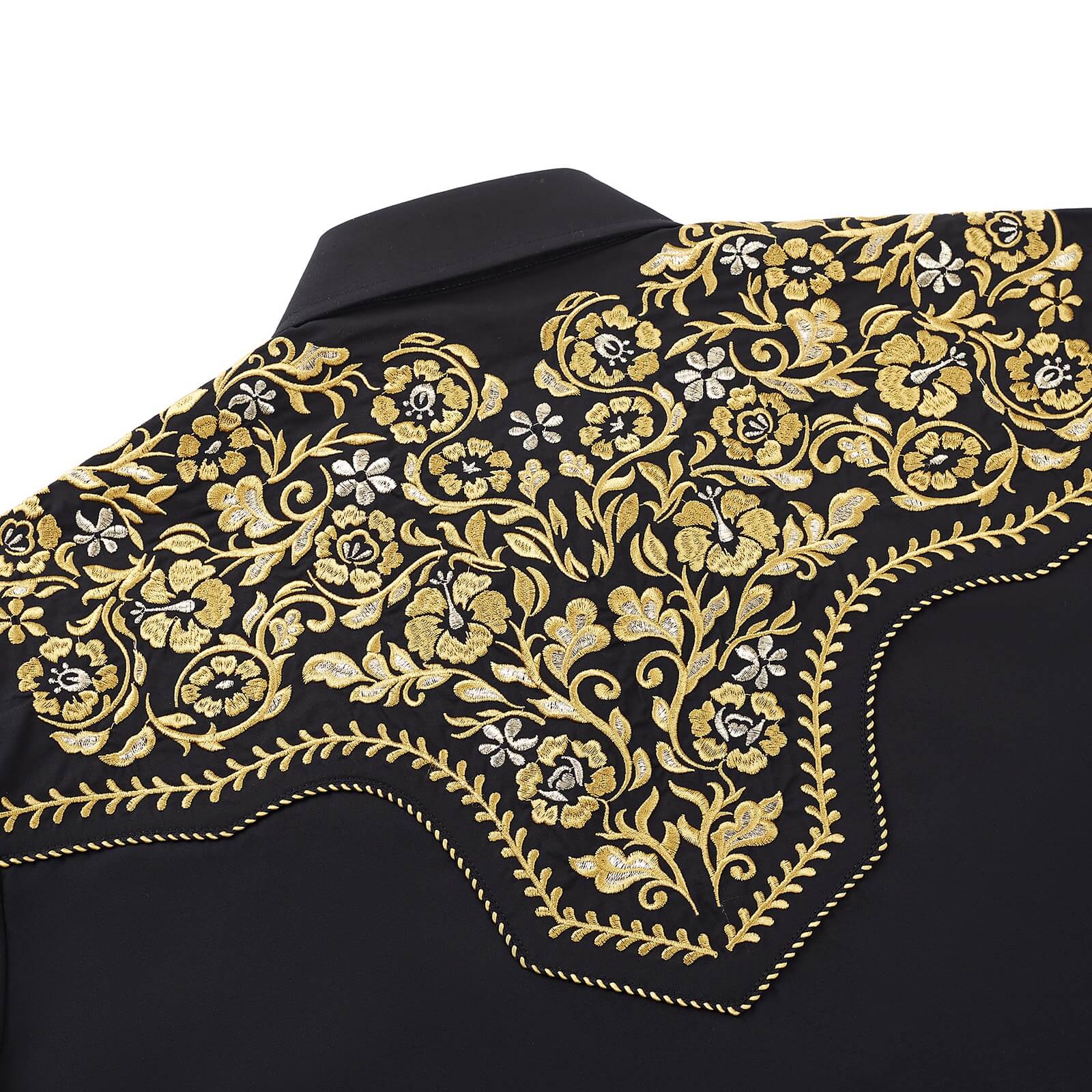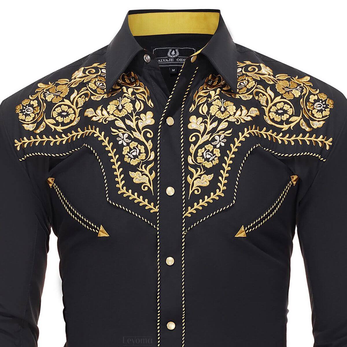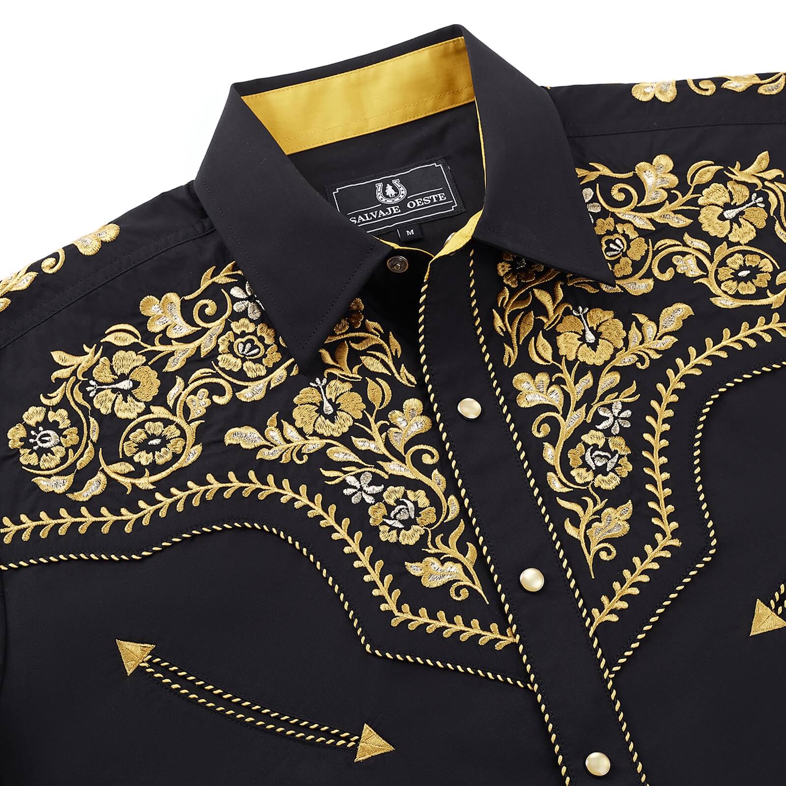 Introducing The Gold Vaquero Men’s Embroidered Western Pearl Snap Shirt, a striking black long-sleeve western dress shirt with real smiley pockets, genuine floral embroidery, and authentic pearl snaps. Designed with bold daring western style that commands any room, this shirt is made for the confident and sophisticated man. If you have a flair for the audacious, and an appreciation of that which is unique, this fearless and authentic western piece is the perfect new addition to your wardrobe.